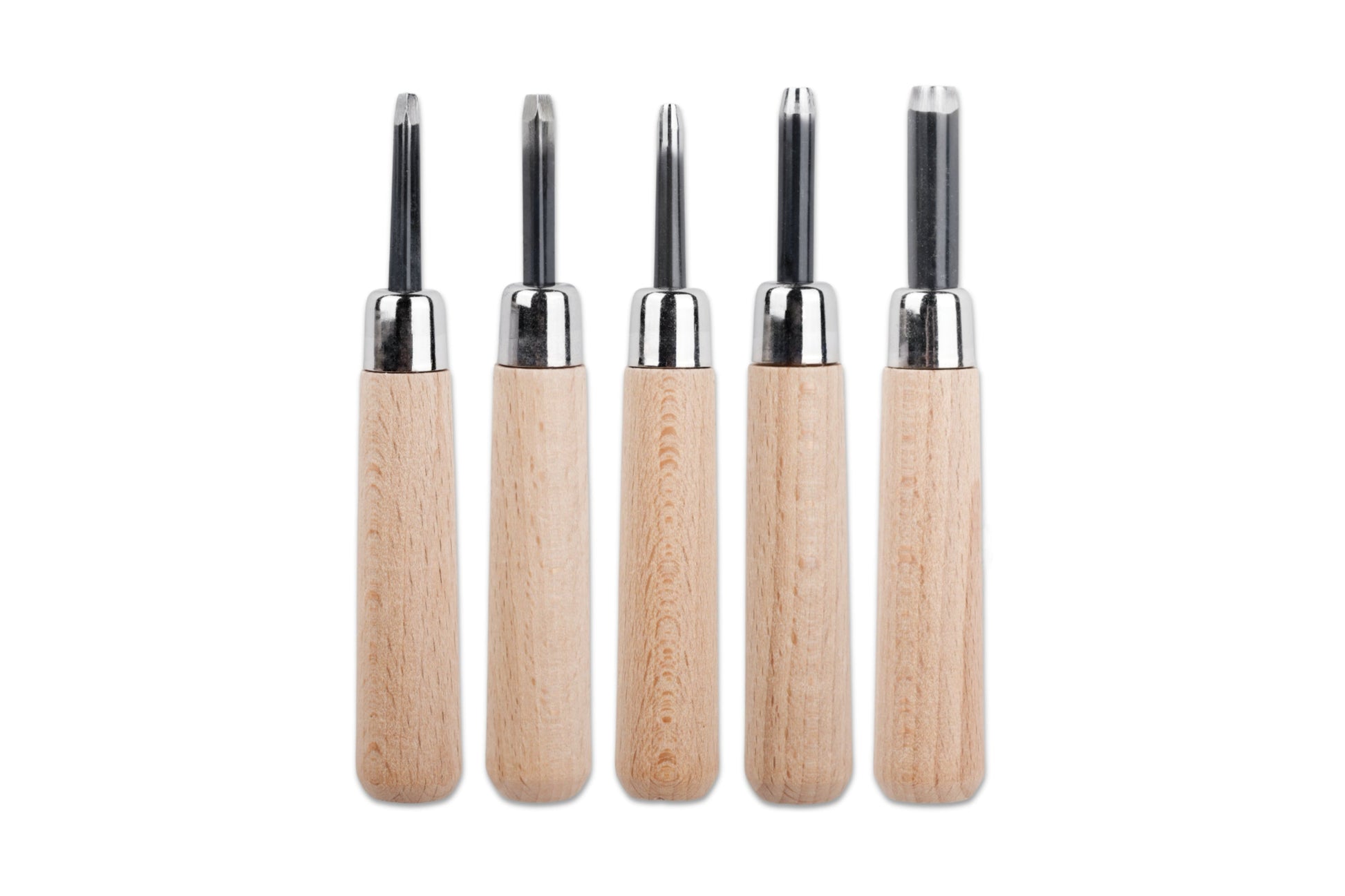For linocut printmaking, we've always recommended these five cutter shapes: a small V, a medium V, and three U-shaped chisels. You can make almost any design, at any scale, with just these five tools. The steel blades have been sharpened carefully by the artisans at RGM, then set into natural beechwood handles.