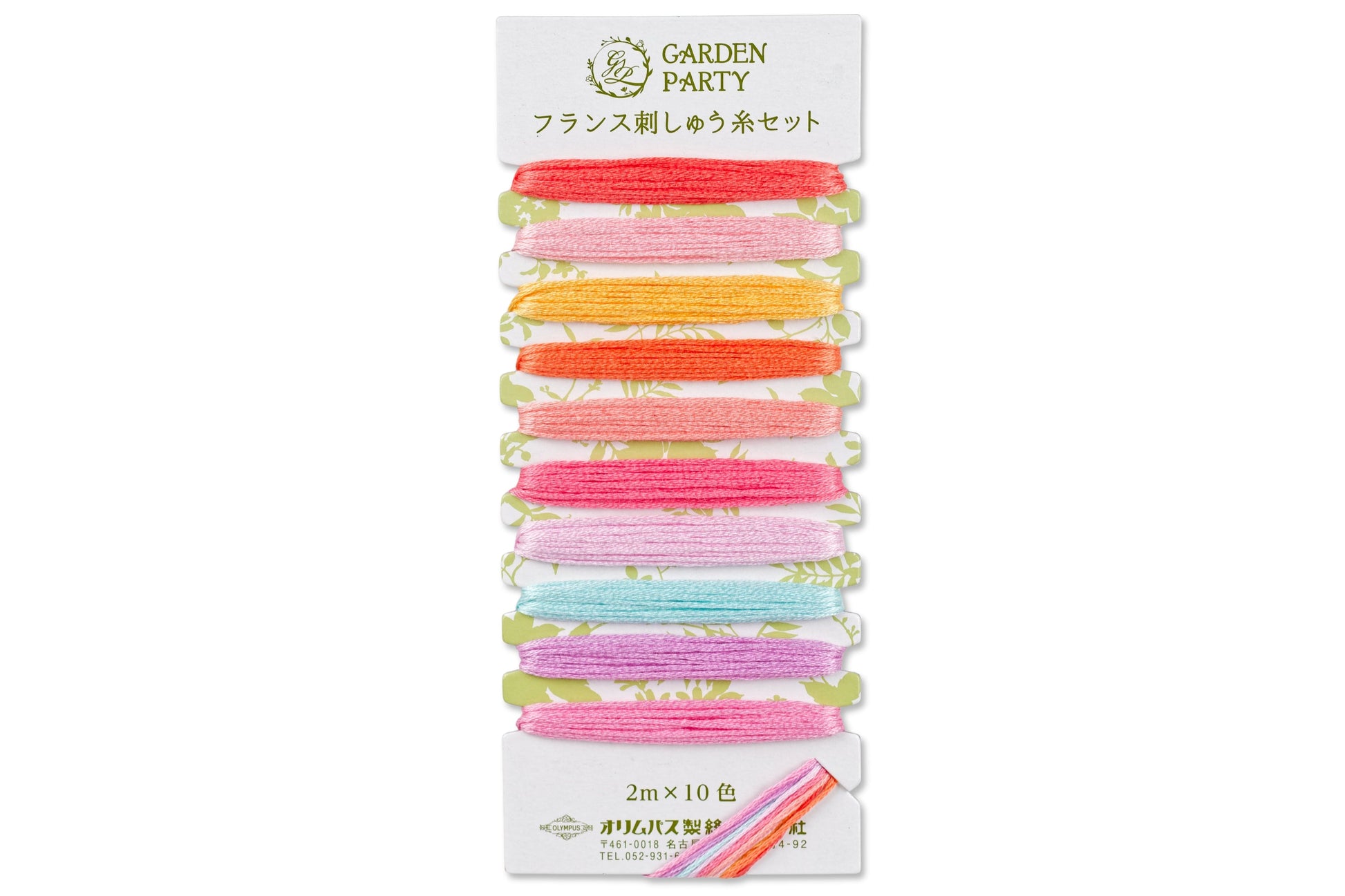 Outstanding luster and expressive colors are the key features of Olympus embroidery floss, which reveals its 100-year history in the beauty of each stitch. You'll find 10 perfectly coordinated colors on each Garden Party card, with two meters (2.2 yd.) of thread per color.