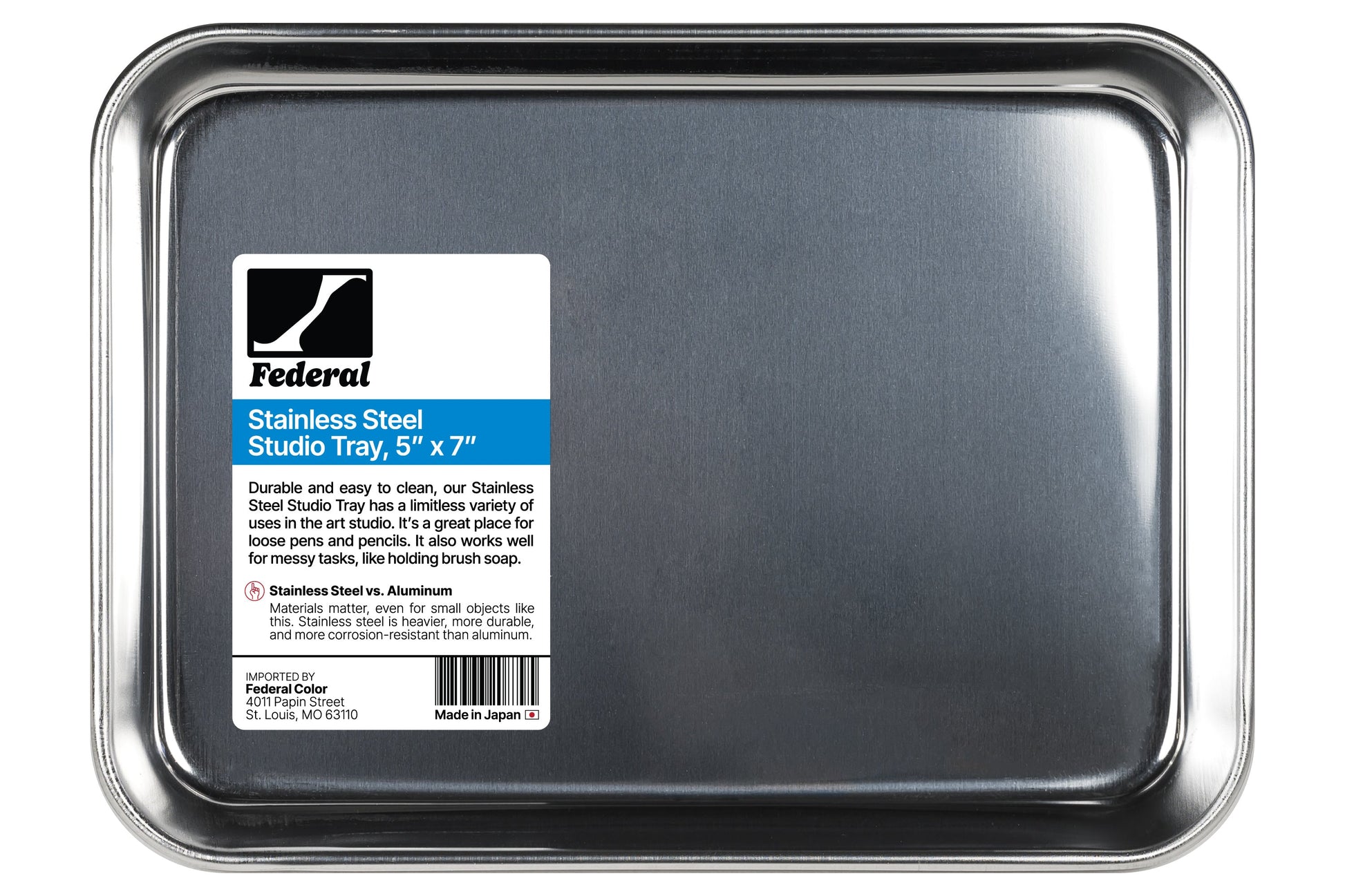 This small, all-steel tray is a perfect office accessory or studio storage add-on. Measuring approximately 5" x 7", it's the right size for your keys, pens, pencils, erasers, and other small desktop essentials. Because it's made from durable, washable stainless steel, It can also be used as a painting palette.
