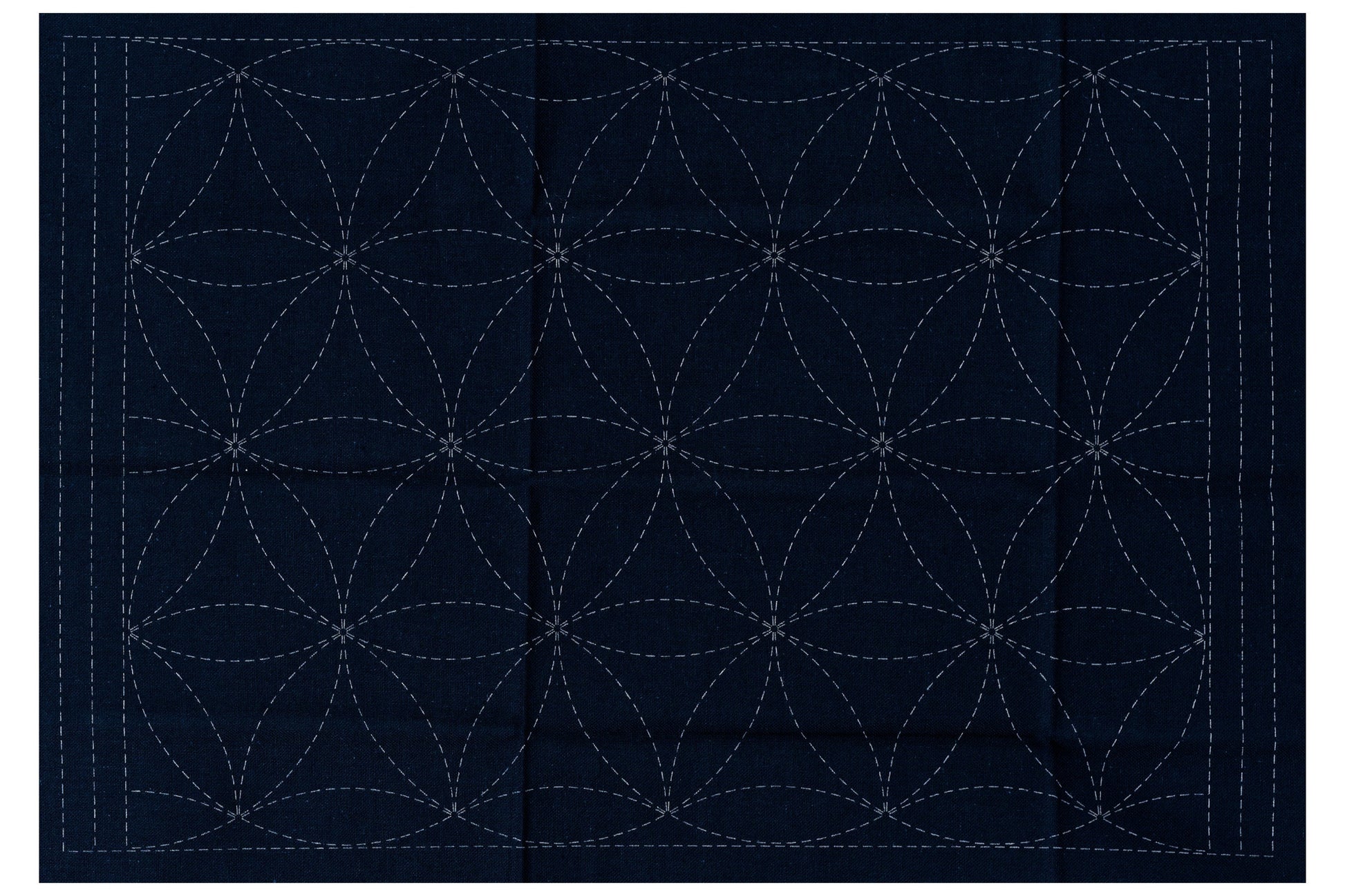 This 100% cotton sashiko cloth has a hana-guruma (flower cart) pattern in wash-away white ink. Sew along the dashed lines to create the pattern stitch by stitch.