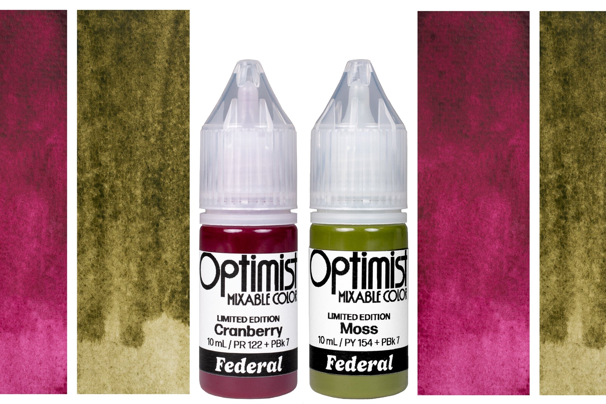It's our first-ever Optimist Limited Edition release! We've mixed up two seasonally-inspired colors: deep Cranberry and complex Moss. You can use these with the rest of your Optimist Mixable Color collection, or try them as standalone inks for dip pen calligraphy, writing, and drawing. Both colors are lightfast and permanent.