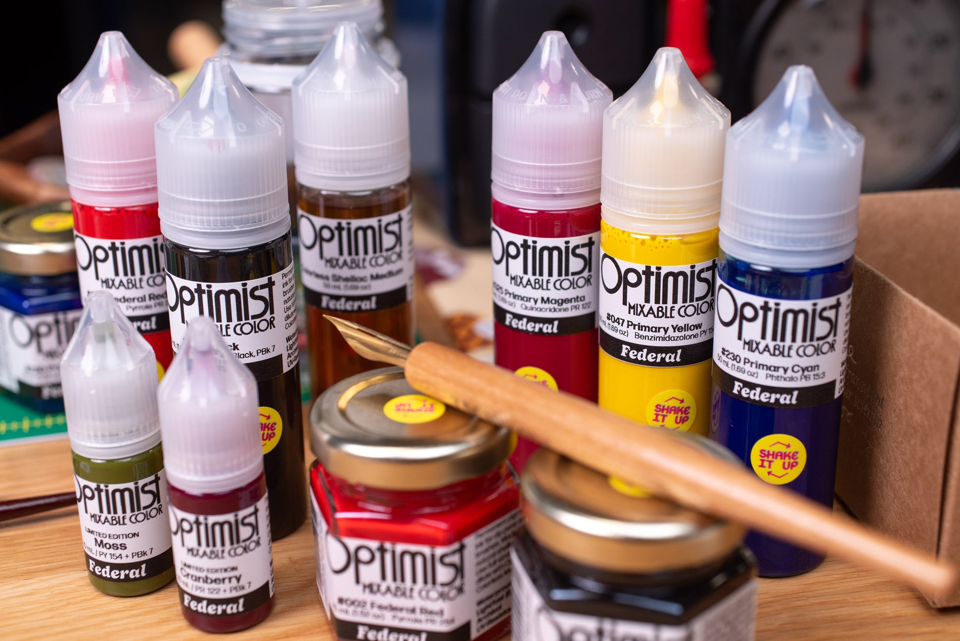 We opened our art supply business in 2015, and one of the first things we learned was how to make india ink. Our original formula was hand-mixed and much less consistent than Optimist, but our customers loved it because traditional shellac-based ink is just special, and it's not that easy to find anymore. Most manufacturers have replaced shellac with acrylic polymer, which has its advantages but is simply not as beautiful as shellac resin.
