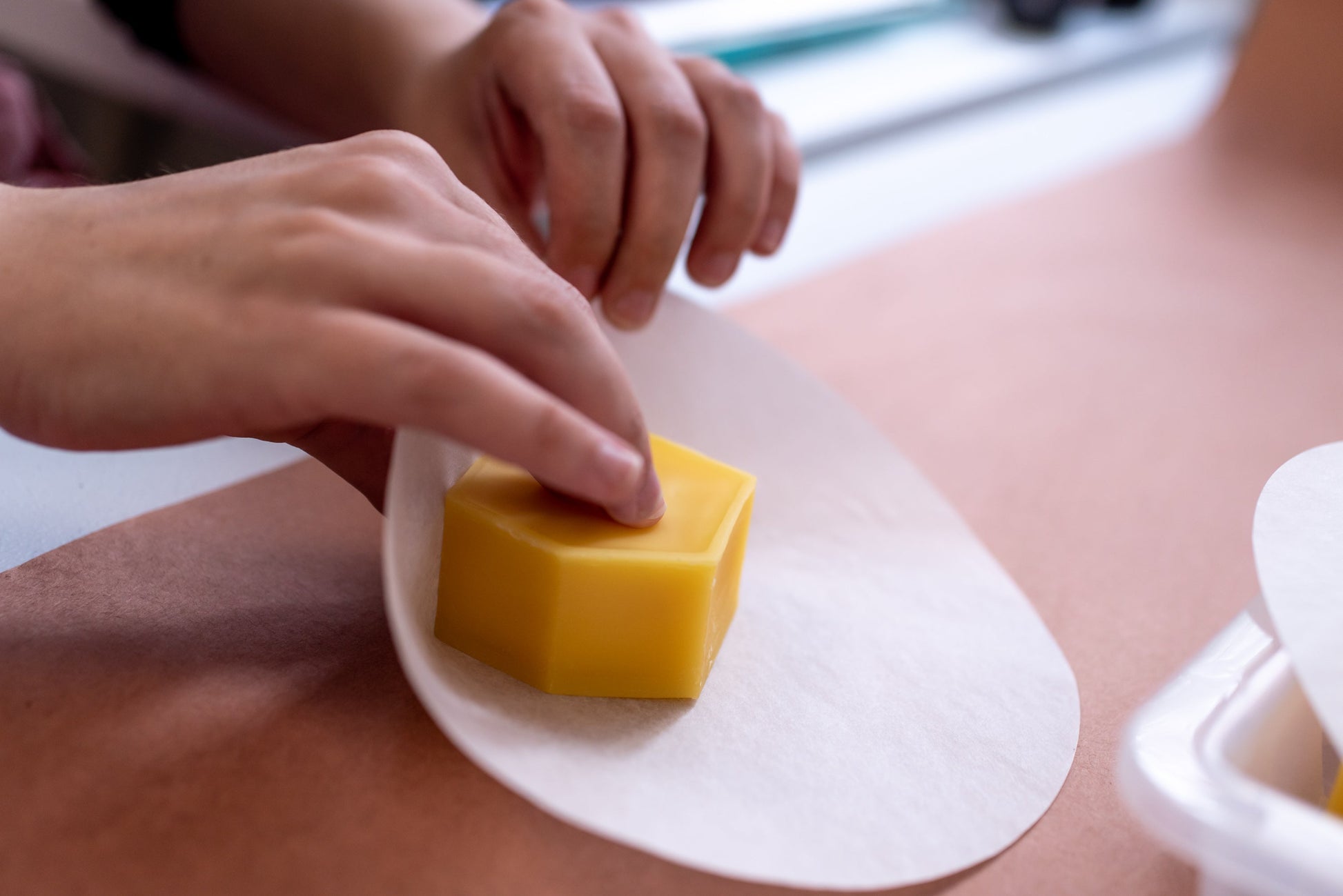 Bookbinders will especially appreciate Federal Pure Yellow Beeswax Blocks—the wide base sticks to your work surface with a little downward push, so it won't move around while you wax your thread.