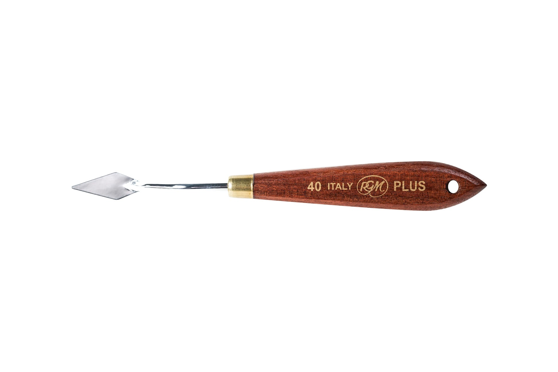RGM Plus painting and palette knives are made from high-quality, electroplated steel, so they don't easily get stuck or skip when spreading paint. The handle is dark bubinga wood with a brass ferrule and a hole for hanging from a pegboard.