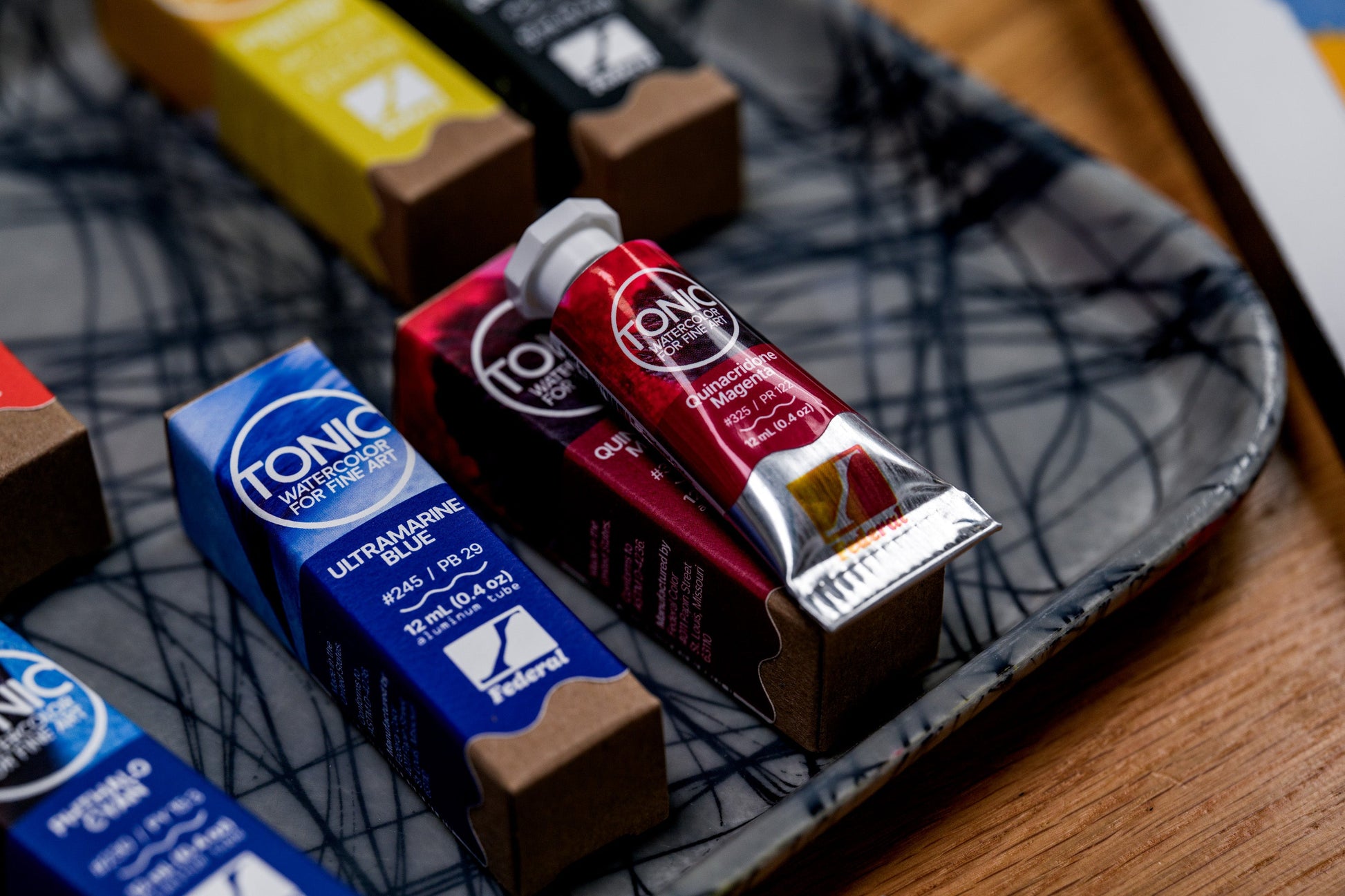 Hand-filled in St. Louis, our aluminum tubes are the most direct way to put Tonic on paper. Professional painters often prefer tubes, because they offer excellent control of the crucial pigment/water ratio. You can paint with Tonic tubes full-strength for intense, dark, semi-opaque color, or dab just a touch on your palette for bright, clear washes.
